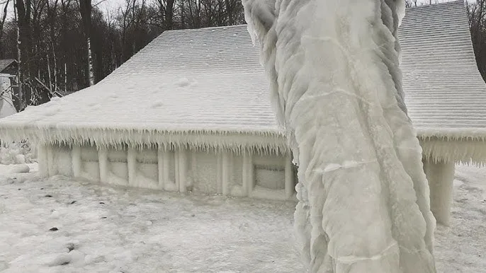 At the very edge of town stood an old house—isolated, silent, and completely consumed by ice. While every other home showed signs of life—smoke rising from chimneys, lights glowing faintly through windows—this house stood frozen in time. Snow and frost had taken over its walls entirely, forming an eerie white shell around the structure.